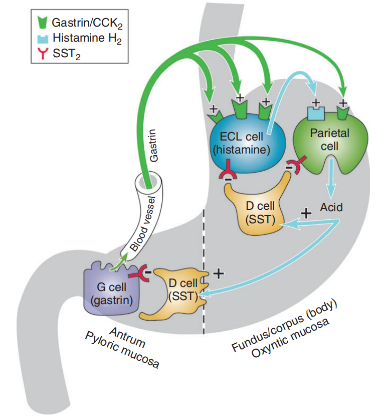 Schubert ML, Rehfeld JF. Gastric Peptides-Gastrin and Somatostatin. Compr Physiol. 2019;10(1):197-228. Published 2019 Dec 18. doi:10.1002/cphy.c180035